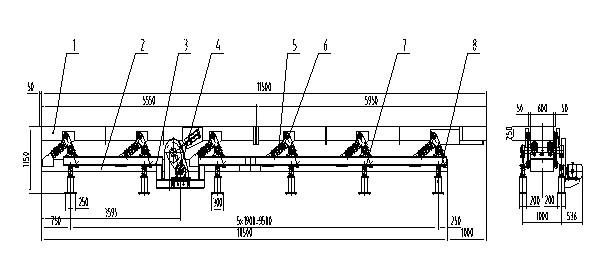 1.輸送槽; 2.平衡架; 3.底架; 4.偏心連桿驅(qū)動裝置; 5.共振彈簧; 6.彈性擺桿裝置; 7.減振彈簧; 8.減振座